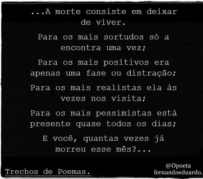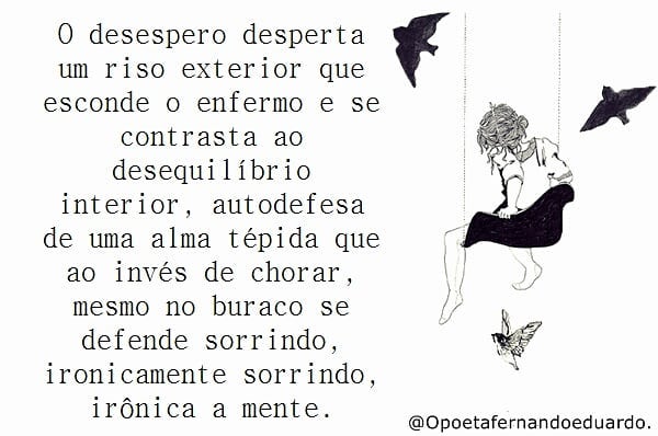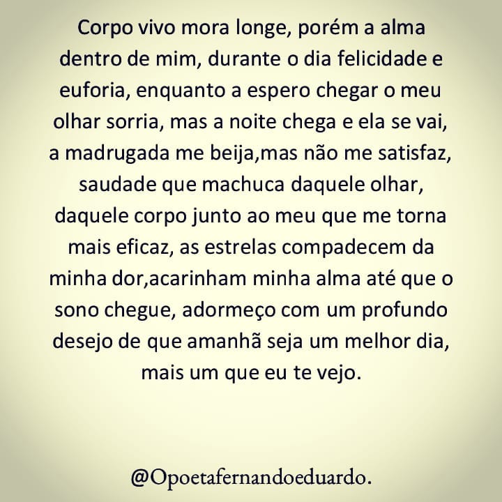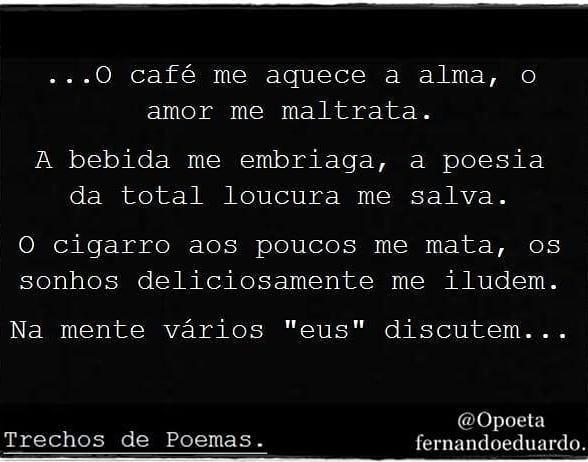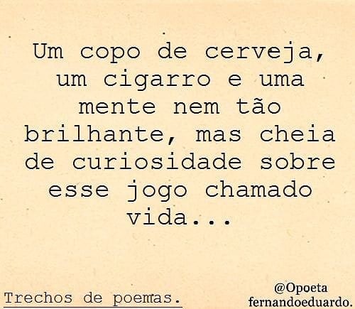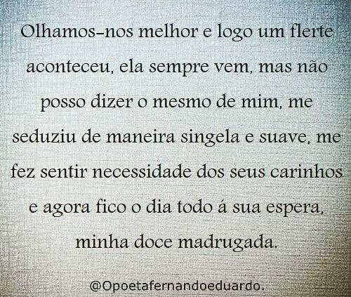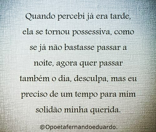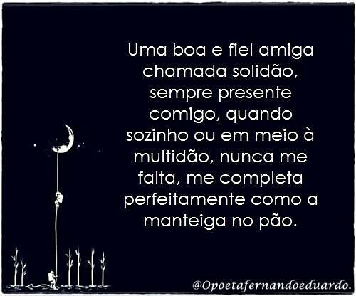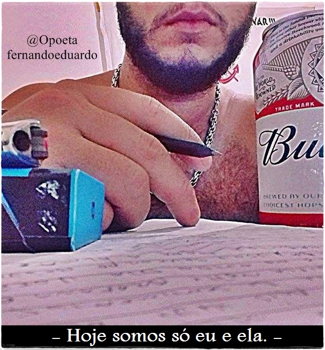 Conversamos por horas, te conto meu dia. A faço rir, mostro minhas novas escritas. Geralmente ela gosta bastante e não me critica. Talvez por também amar poema e poesia. Ingerimos uma demasiada quantidade de cerveja. Com intervalos para um cigarro e algumas reflexões. A todo tempo escutamos boas musicas Assistimos vídeos que nos agradam Lemos artigos interessantes, geralmente curtos. Tentamos também interagir com o mundo lá fora. Mesmo eu não sendo tão sociável e querido por ai. Mão não tenho muito sucesso, pois ela é muito ciumenta. Infelizmente a maioria que a conhecem, odeiam-te. Ela diz que não liga, mas eu vejo nos seus olhos que dói. O álcool surti efeitos e aumenta se a quantidade de cigarros. Ela percebe e com jeito me convence a parar e ir dormir. Fumo o ultimo cigarro, urino e me deito com ela. Ela então me abraça em uma posição e me dá Boa noite. Agradeço por mais um dia vida e faço minha oração. E termino a dizendo “Tenhas uma ótima noite Solidão”.